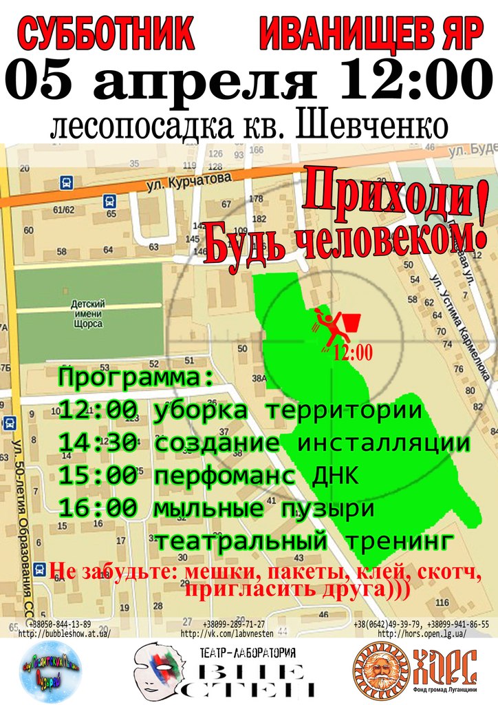 5 апреля в Луганске стартовала акция «Приди. Будь человеком», организованная театром- лабораторией «Вне стен», Общественной организацией «Агентство устойчивого развития Луганского региона» и Фондом громад Луганщины «Хорс».