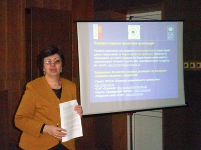 18.03.2011 Проект ПРООН «Розвиток громадянського суспільства» у партнерстві з Ініціативним центром сприяння активності та розвитку громадського почину "Єднання" (ІСАР "Єднання") провели інформаційну сесію в залі засідань Головного управління економіки Луганської облдержадміністрації щодо оголошеного грантового конкурсу для організацій громадянського суспільства (ОГС) для семі областей України за темою «Захист прав людини через посилення спроможності правозахисних ОГС». В інформаційній сесії прийняли участь біля 25 осіб з числа представників громадських організацій Луганської області, органів влади та районних ресурсних центрів розвитку громад. Гості з ПРООН та ІСАР "Єднання" роз’яснили всі правила та умови участі в конкурсі.