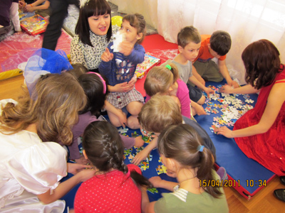 Після вистави улюблені герої залишилися пограти з дітьми - спочатку збирали пазли з зображенням фрагментів європейських казок таких як «Книга джунглів» , «Червона Шапочка» , «Попелюшка» , далі визначали батьківщину відомих казкових персонажів - Кіт у чоботях, Піноккіо, Чіполіно, Маленький принц, Червона шапочка та інших і робили примітки на карті Європи, яку привезли у подарунок дитячому будинку .Слідом за такою пізнавальною та веселою грою на вихованців Луганського обласного дитячого будинку №1 чекав ще один сюрприз – Центр Європейської інформації подарував діткам книжки-розмальовки за мотивами європейських казок, які дітлахи одразу ж взялися розфарбовувати .Сумувати нікому не довелося - кожен герой «Казкової подорожі до Європи» разом з дітками розмальовував зображення та вказував на те ,з якої ж країни до нас прийшла та чи інша казка. Також всі діти намагалися поспілкуватися з гостями і волонтери відповідали на шквал добрих та наївних дитячих запитань, наприклад : скільки років Сніговій Королеві, або чому вона вирішила заморозити увесь світ , чи як стати такою ж сміливою і доброю як Пеппі та Добра чаклунка.