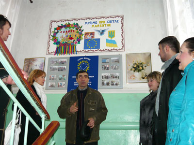 Візит почався з огляду селищної школи, на базі якої розташовано дві кімнати музею: перша - присвячена історії селища, Героям соціалістичної праці та Великої Вітчизняної війни; друга - виконана в стилі «Світлиці», де розміщені вироби місцевих майстрів. Школа дуже вразила своєю охайністю та затишністю. На стінах школи намальовані яскраві малюнки, в класах все зроблено для зручності дітей (навіть на партах прикріплені пластмасові скляночки для олівців та ручок). В кожному класі є окрема виставка дитячої творчості. Ще вразило те, що діти замість того щоб бігати на перервах грають в теніс, в холі є новий тенісний стіл.
