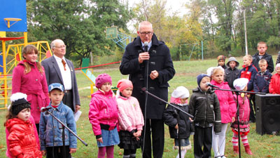 Гостей зустріла господарка території – сільський голова Наталя Василівна Чуприна. Після цього розпочалась урочиста частина. Маленькі мешканці підготували веселий концерт, віршами та піснями подякували гостям за новий гарний майданчик. Право урочистого відкриття та розрізання червоної стрічки було надано Клаусу Цилікенсу та Ганні Дороженко. Після завершення урочистого відкриття, місцевий краєзнавець Захарченко Іван Михайлович розповів про історію село та активісти ГО «Вектор» показали, гордість села – відремонтований будинок культури, і розповили пану Генеральному Консулу чим живе село сьогодні.